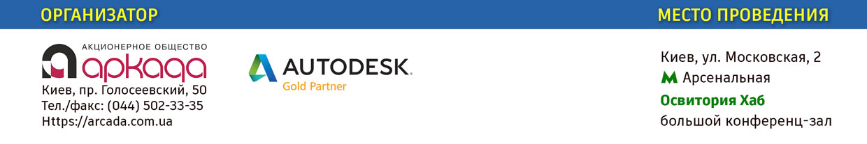 ЧАО «Аркада» и компания Autodesk приглашает Вас 22 сентября в «Освитория Хаб», одно из красивейших мест Киева, расположенное на территории отреставрированной Арсенальной площади на строительную конференцию «Успех клиентов Autodesk: BIM шагает Украиной».